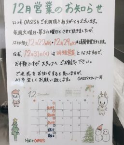お知らせNEWS 12月、営業日のご案内☆ 2020/12/04 皆様こんにちは(^▽^) 今回は12月の営業日について ご案内させて頂きます! 毎週火曜日、第三水曜日をお休みと させて頂いておりますが、 16日(第三水曜)、22日、29日(火曜日)は 営業致します(^▽^) 素敵な新年を素敵なお髪で迎えられますように お手伝いができたらと思っております! 皆様にお会いできることを心から 楽しみにお待ちしております(^▽^) OASISスタッフ一同